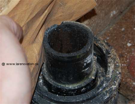 On coupe donc au rebord de la pièce brisée en utilisant une scie à métal, et on l'enlève. Puis, on fait le montage des pièces de rechanges, sans colle ABS, pour calculer la longueur nécessaire à couper sur le tuyau existant, et être ensuite capable de glisser les nouvelles pièces en place. On va sabler le rebords des tuyaux usagés pour s'assurer d'une bonne adhérence.